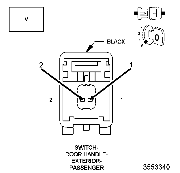2. Measure the voltage between the (P401) Passenger Passive Handle Switch Return and the (P400) Passenger Passive Handle Sense circuits in the Passenger Exterior Door Handle Switch connector.