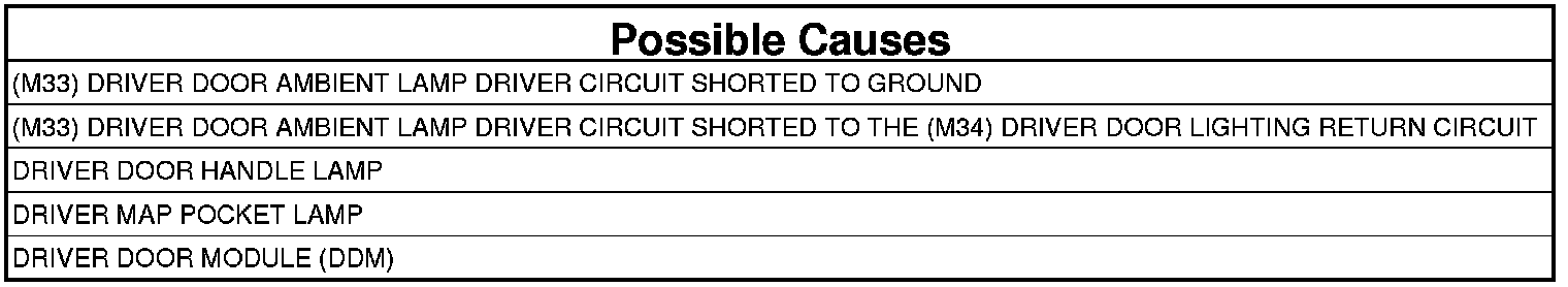 - Repair the short between the (M33) Driver Door Ambient Lamp Driver circuit and the (M34) Driver Door Lighting Return circuit.