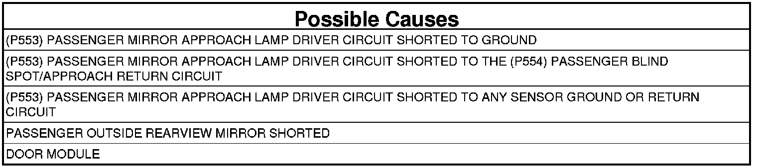 3. CHECK (P553) PASSENGER MIRROR APPROACH LAMP DRIVER CIRCUIT FOR A SHORT TO THE (P554) PASSENGER BLIND SPOT/APPROACH RETURN CIRCUIT