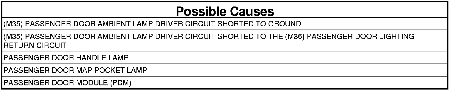 5. (M35) PASSENGER DOOR AMBIENT LAMP DRIVER CIRCUIT SHORTED TO THE (M36) PASSENGER DOOR LIGHTING RETURN CIRCUIT
