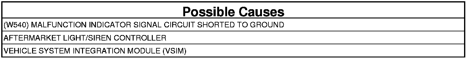 - Repair the (W540) Malfunction Indicator Signal circuit for a short to ground.