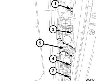 5. Disengage the front door wire harness boot (5) and connector from the outside of the lower A-pillar.