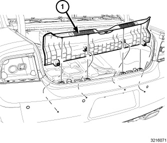1. Align and position the trunk scuff trim panel (1) to the vehicle.