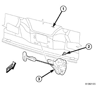 5. Remove the two screws (2) that secure the latch (3) to the inside of the deck lid (1).