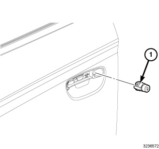 3. Using hand pressure, push on the face of the lock cylinder (1) until it pops out of the cavity in the back of the door handle.