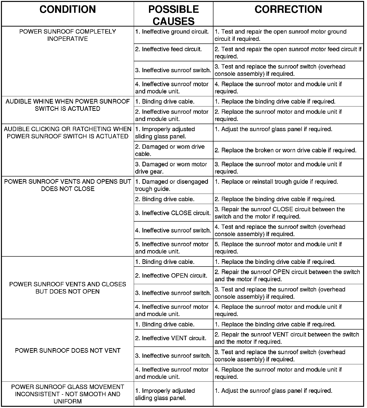 However, conventional diagnostic methods will not prove conclusive in the diagnosis of the electronic module integral to the power sunroof motor. If the power sunroof switches, motors and circuitry test okay, but the express or Excess Force Limitation (EFL) features are still ineffective following the calibration and initialization procedures, the motor and module unit must be replaced.