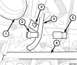 2. Install the metal bypass tube while positioning the water pump (3) to the timing chain cover. Tighten mounting bolts (6) to 24 Nm (18 ft. lbs.).