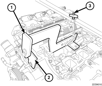 19. Using the Engine Lift Fixture (1), Engine Lift Adapter (2) and the Engine Support Fixture (3) lower the engine into position and remove.