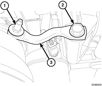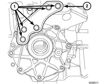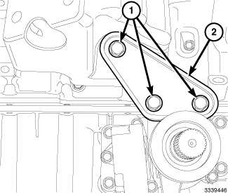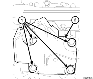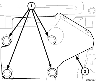 3. Remove the engine mount isolator bracket retaining bolts (1) and remove the bracket (2).