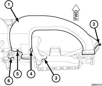 1. Position the left side instrument panel duct (2) to the instrument panel support (6).