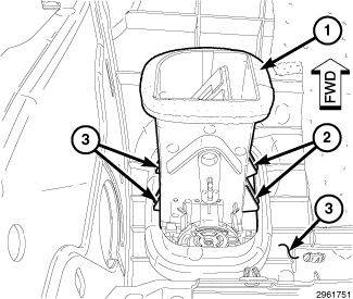 3. Install the trim panel (1) onto the back of the floor console Floor Console - Installation.