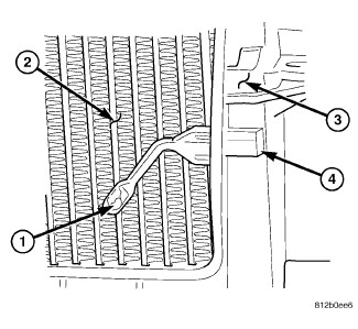The evaporator temperature sensor (1) measures the temperature of the conditioned air downstream of the A/C evaporator (2). The evaporator temperature sensor is an electrical thermistor within a molded plastic case that is inserted into the HVAC housing (3) near the coldest point of the A/C evaporator. Two terminals within the connector receptacle (4) connect the sensor to the vehicle electrical system through a wire lead and connector of the HVAC wire harness.
