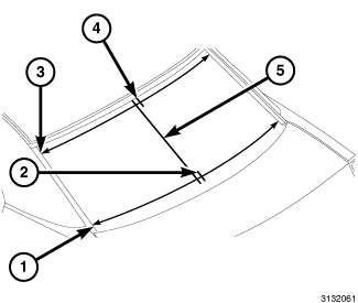 1. Take a measurement (3) across the upper edge of the back glass using the vertical edges of the body back glass opening as the reference points.