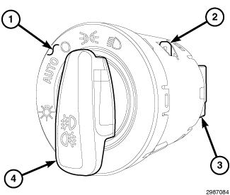 NOTE: Before attempting to install the headlamp switch (1), be certain that both pawl-like retainers (2) are extended outward from the body of the switch. If the retainers are in the retracted position, rotating the headlamp switch rotary knob (4) to the OFF (O) position should disengage the retainer retractor mechanism causing the retainers to spring outward from the switch body.
