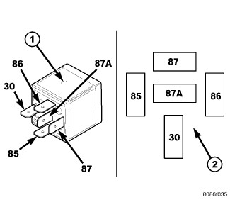 The relay (1) for the rear window defogger system, also known as the Electric Back Light (EBL), is an International Standards Organization (ISO) type relay. Relays conforming to the ISO specifications have common physical dimensions, current capacities, terminal functions and patterns (2). The EBL relay is a electromechanical device that switches battery current through a fuse in the Power Distribution Center (PDC) to the rear window defogger grid and to the heated outside rear view mirrors, when equipped.
