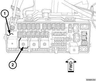 1. Position the EBL relay (2) into the proper receptacle of the Power Distribution Center (PDC) (1).