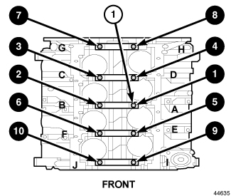 Clean and apply a light oil film to all cap bolts. Install all main bearing caps.Install all M12 cap bolts and alternately tighten in two steps using the following sequence.