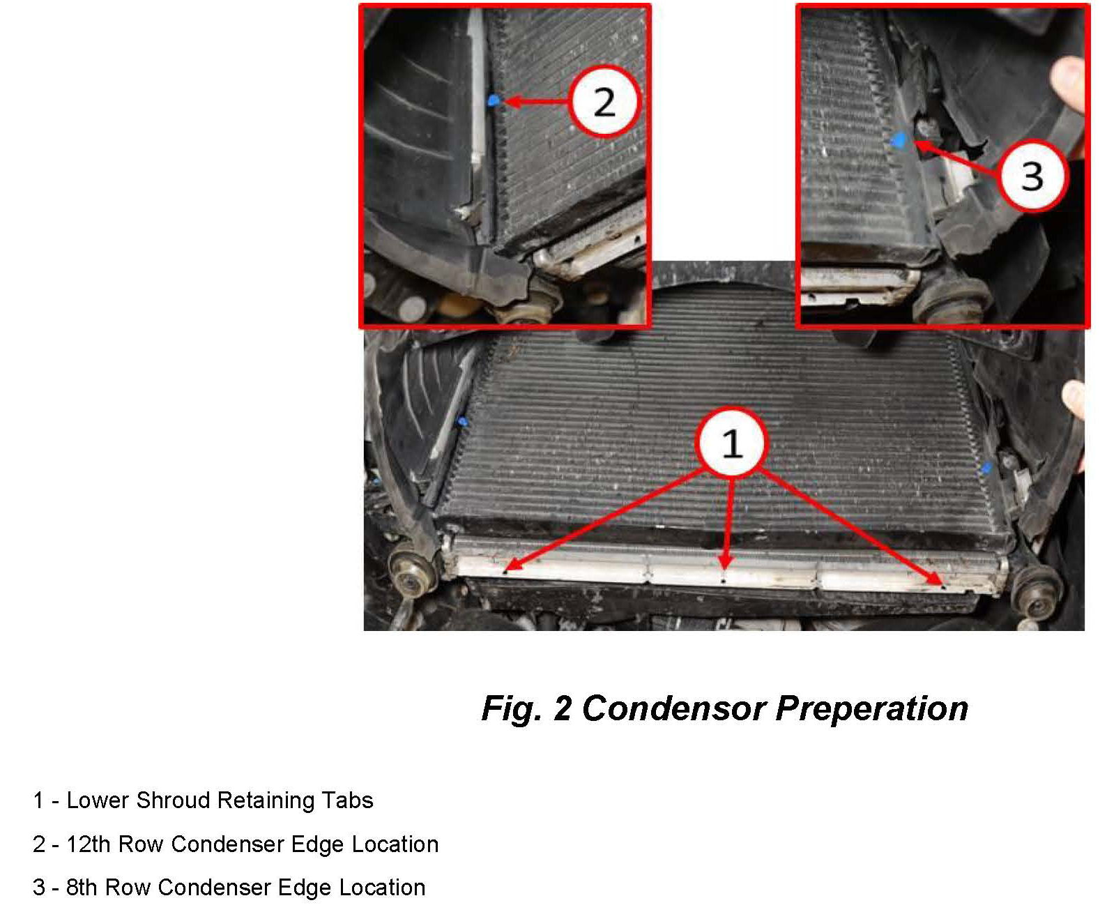9. Viewing the condenser from the front of the vehicle count 8 rows up the driver side of the condenser from the bottom of the condenser core and mark (3) the location of the 8th row (Fig. 2).