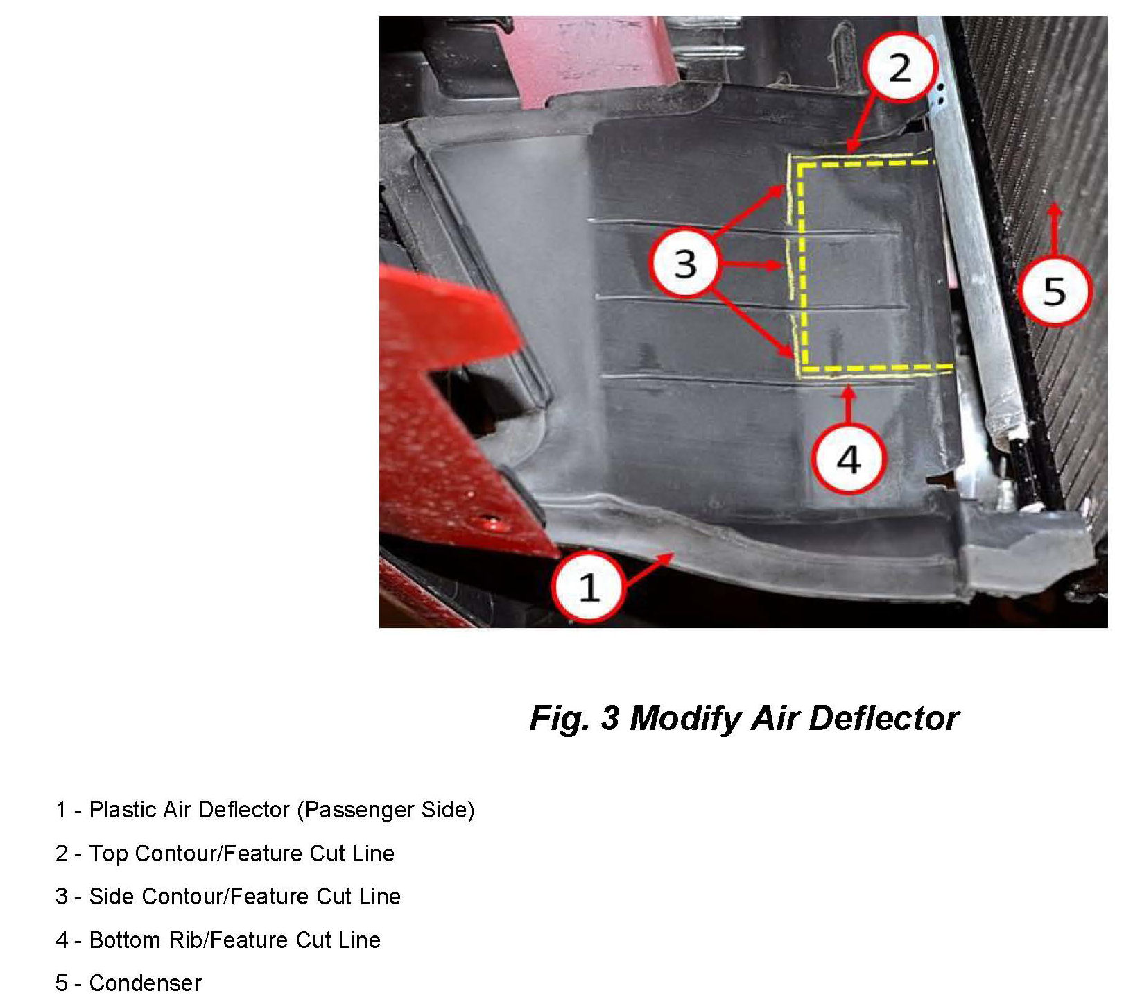 11. Locate the passenger side air deflector (1) and modify it to allow clearance for the installation of the auxiliary steering cooler (Fig. 3).