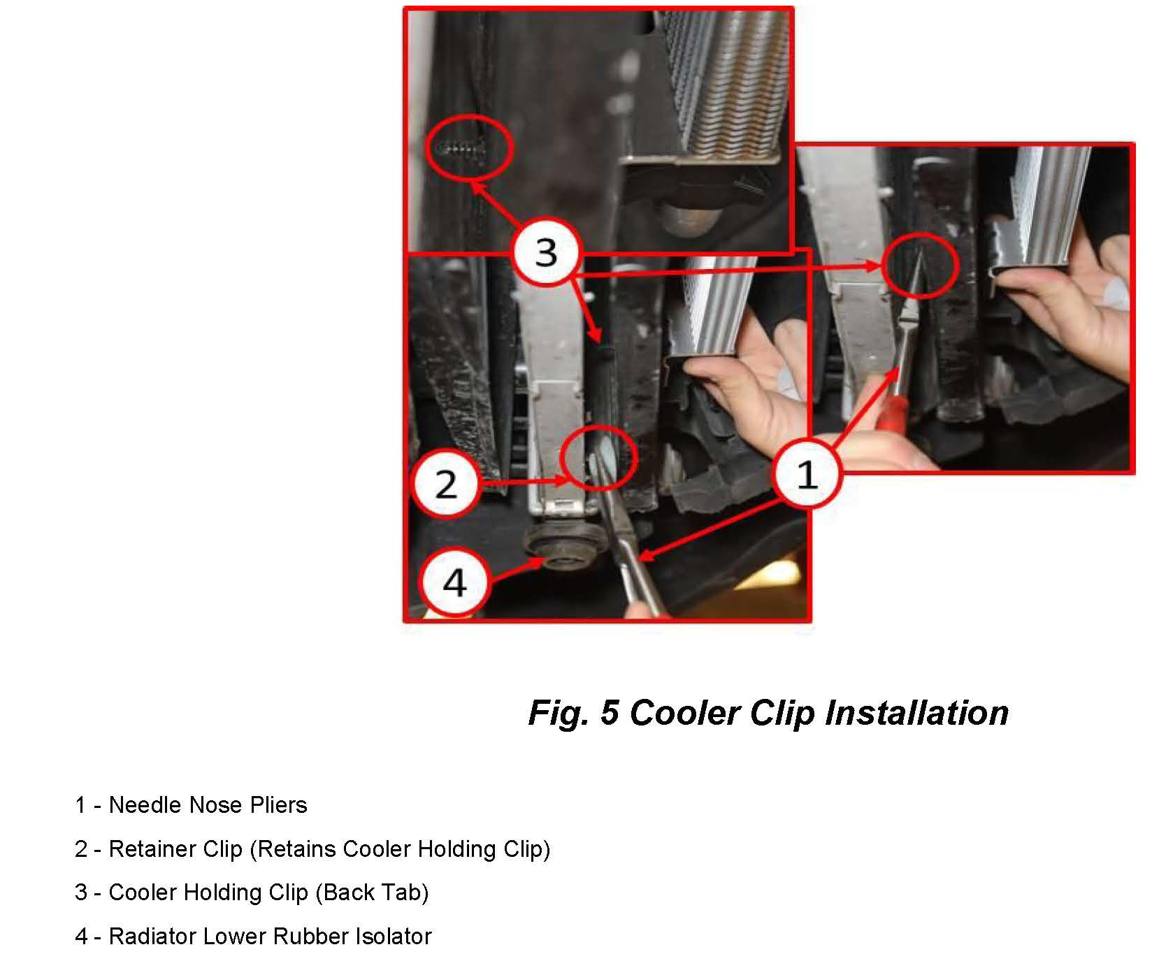 holding clips (3) located between the radiator and the condenser (Fig. 5).