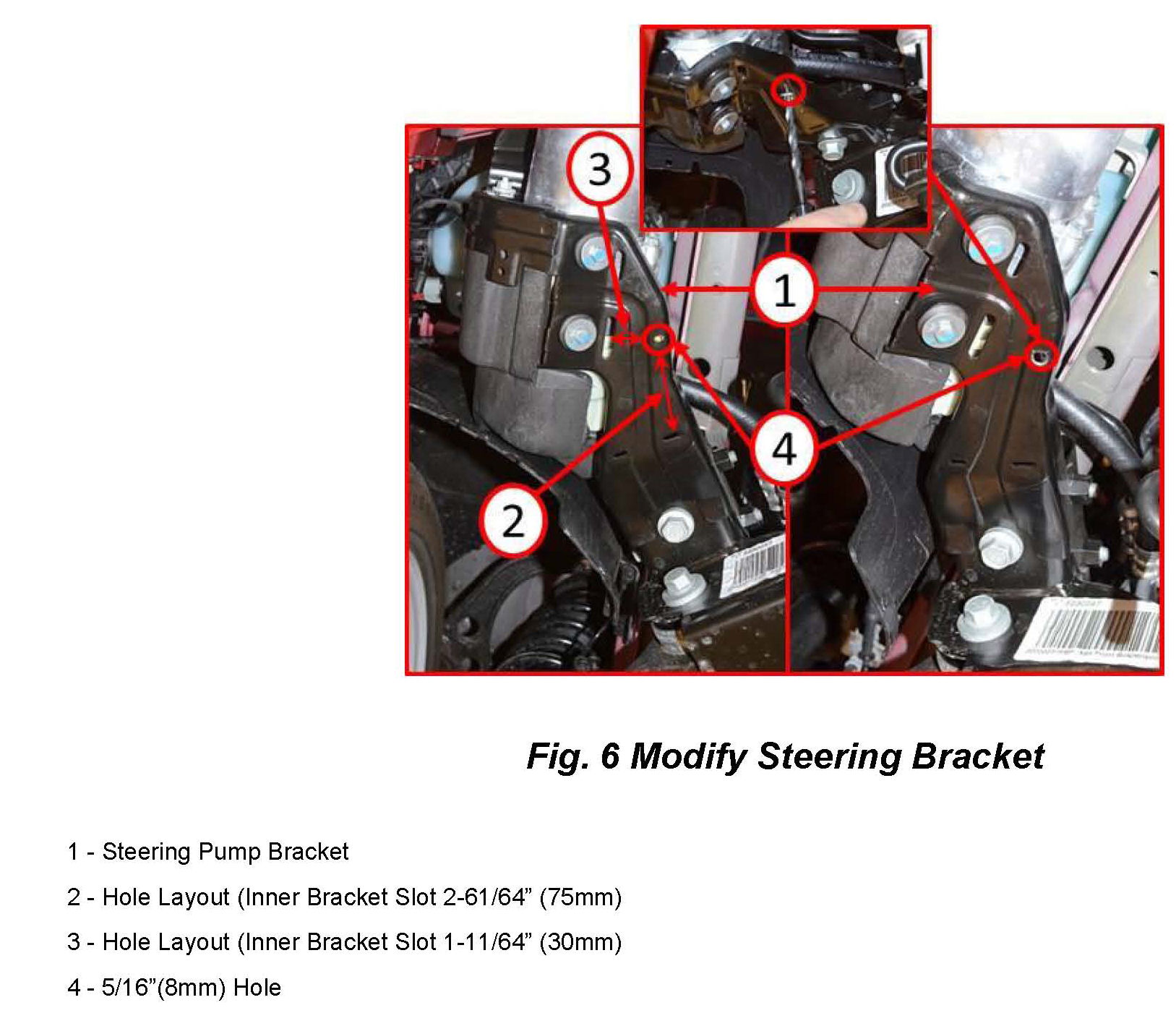 21. Drill a 5/16"(8mm) hole (4) into the mark indicated on the lower steering pump bracket (Fig. 6).