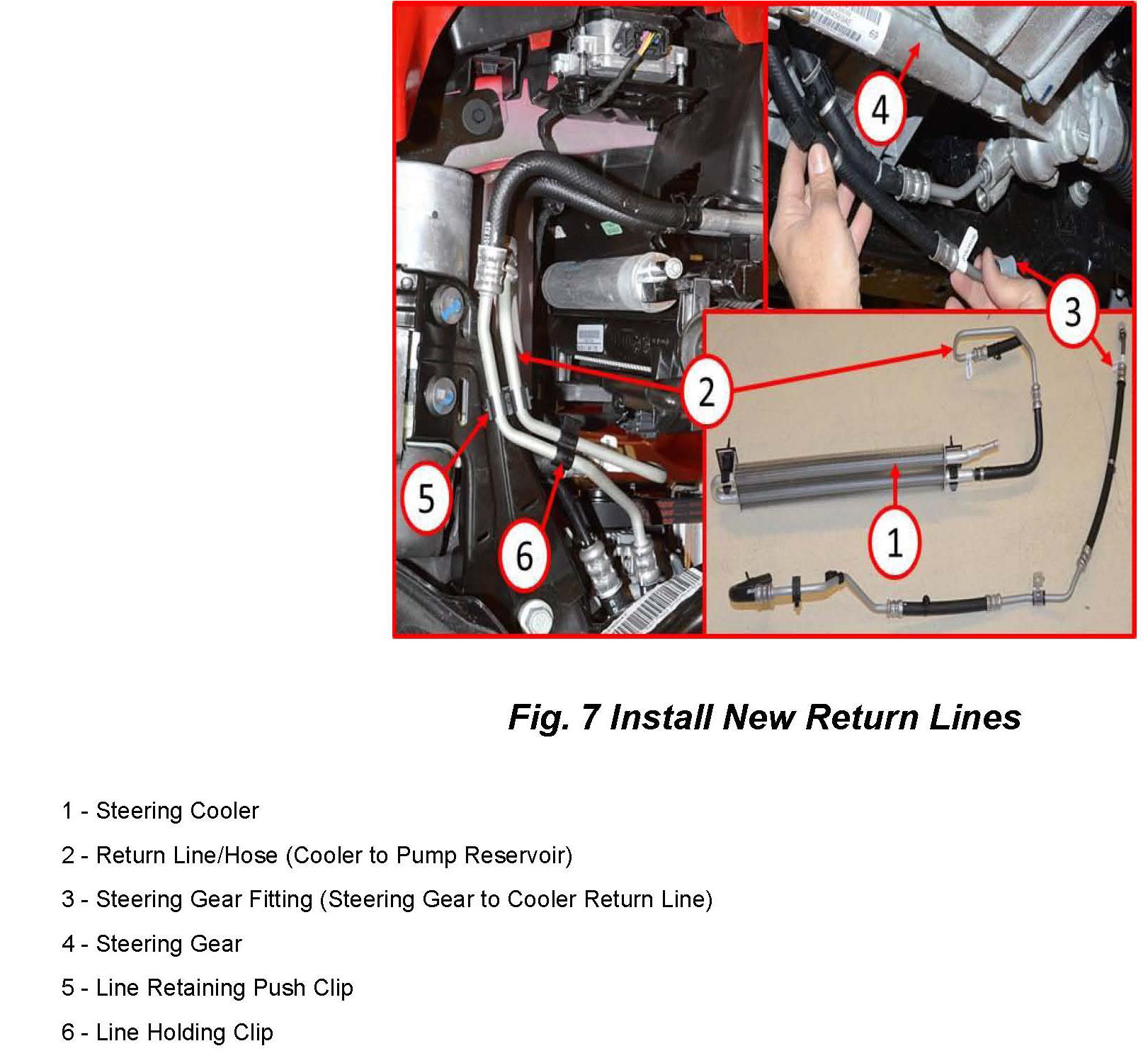 25. Install the line retaining push clip (5) into the hole created in the lower steering pump bracket and connect the holding clip (6) to the cooler to pump return line (2) (Fig. 7).