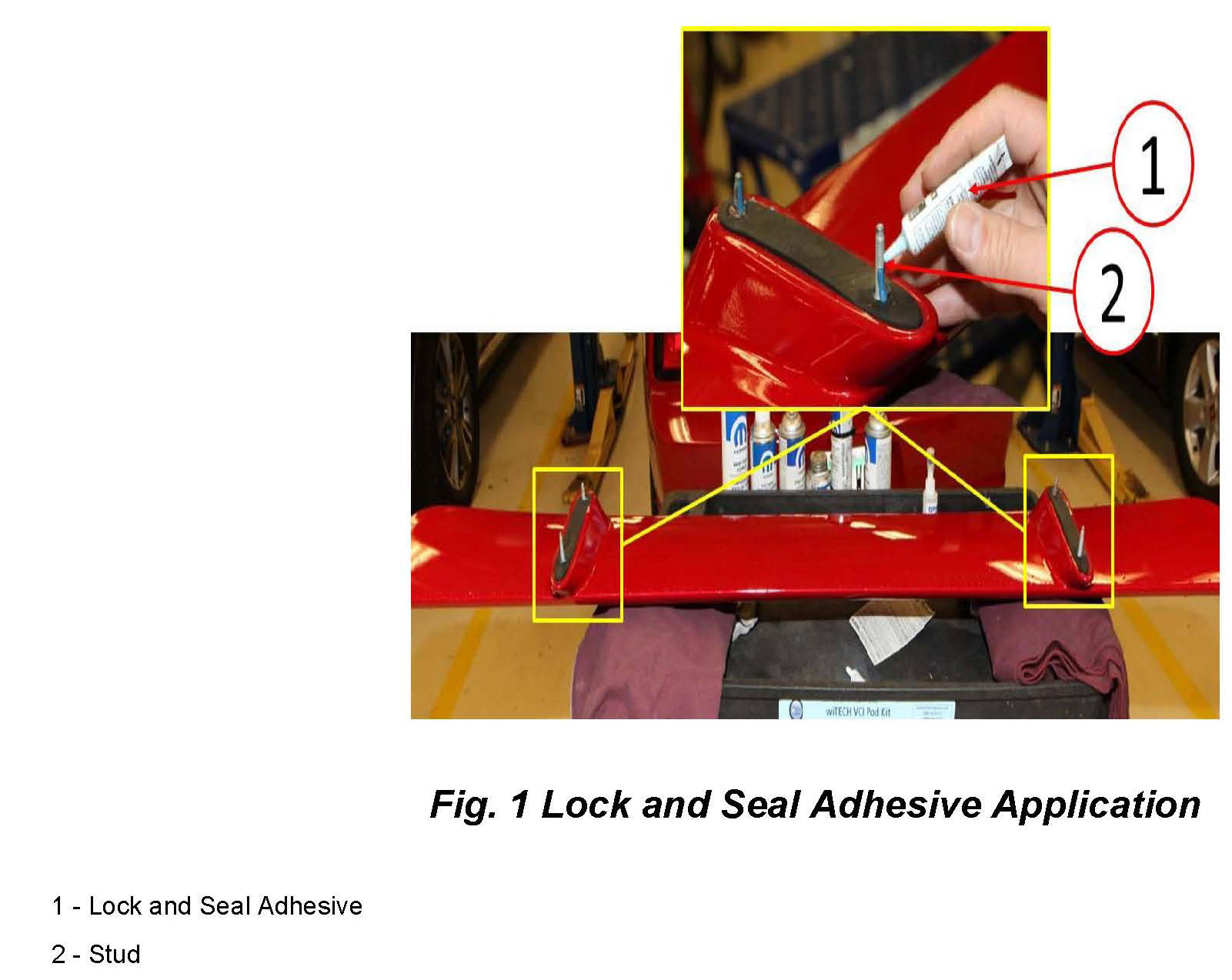 5. Install decklid spoiler while the lock and seal adhesive is still wet. Refer to the detailed procedures available in DealerConnect> TechCONNECT > under: Service Info > 23-Body > Decklid/Hatch/Liftgate/Tailgate > SPOILER, Decklid > Installation.
