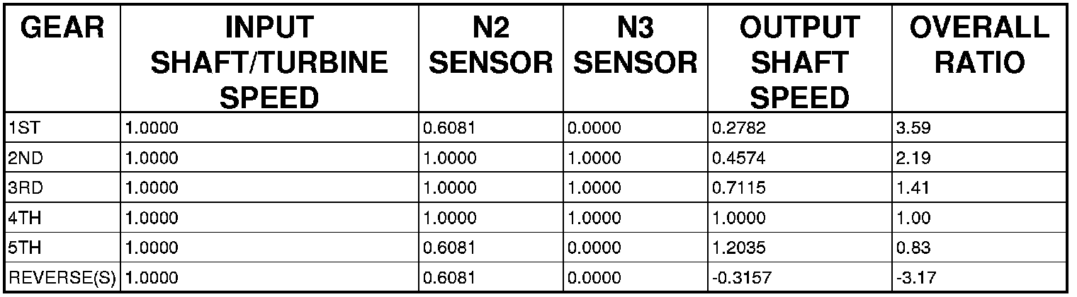 Based on the preceding chart, it appears that N3 sensor is redundant and provides no additional information. However, the TCM needs to know Input Shaft/Turbine speed. Since the N2 sensor is not directly tied to the Input Shaft, the N3 sensor is required to inform the TCM to divide the N2 value by 0.6081 or 1.0000 to calculate actual Turbine speed.