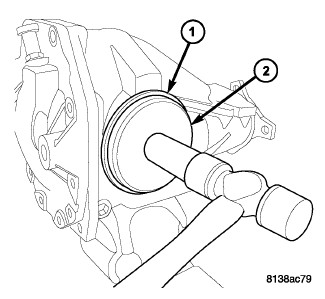 1. Using Installer (2), install NEW axle shaft seal (1). Lubricate the inside diameter with Mopar(R) Gear and Axle Lubricant 75W-140 to protect seal during halfshaft installation.