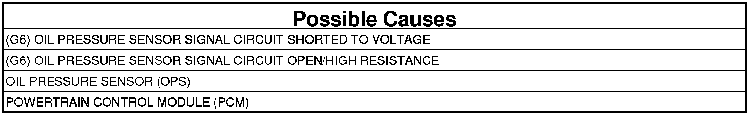 The Powertrain Control Module (PCM) detects that the (G6) Oil Pressure Sensor Signal circuit is above the calibrated threshold for 0.05 second.