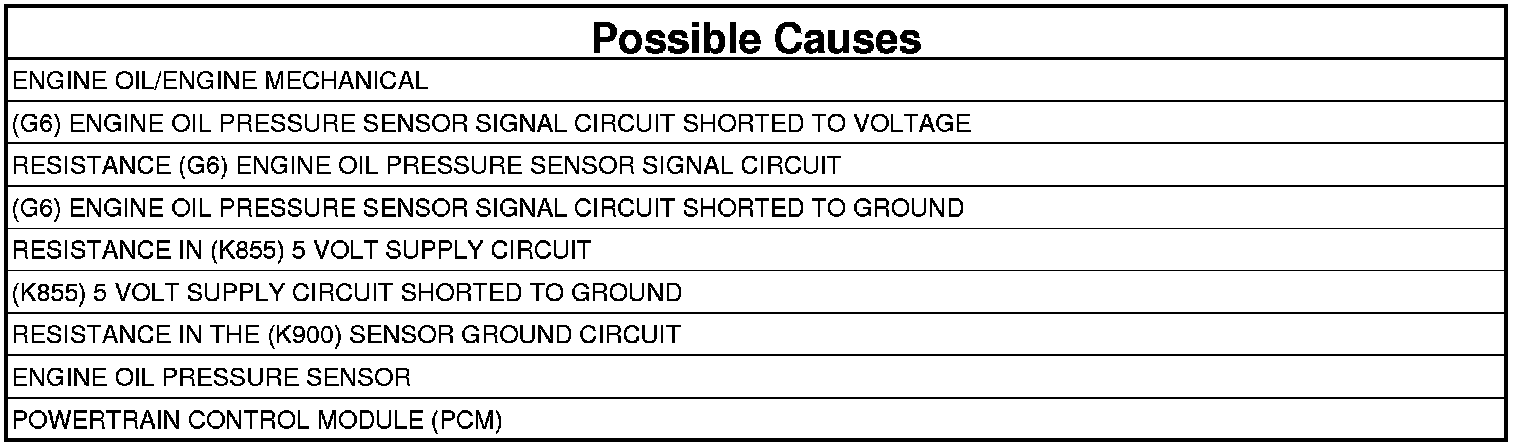 - Verify that there is good pin to terminal contact in the Sensor and Powertrain Control Module connectors. Remove the Engine Oil Pressure sensor and ensure the oil passage/port is free from any blockage. If OK, replace the Engine Oil Pressure Sensor.