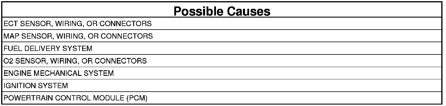 - Poor connector/terminal to component connection for CKP sensor, CMP sensor, MAP sensor, TP sensor, fuel injector, ignition coil, etc.