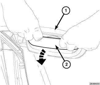 2. Using a flat head screw driver, pliers or equivalent, disengage the mirror cap outboard snaps (1).