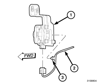 3. Disengage the retainer (3) that secures the Front End Module (FEM) wire harness (2) to the back of the bracket (1).