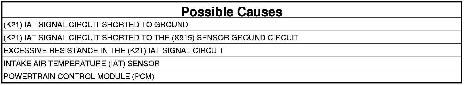 - Repair the (K21) IAT Signal circuit for a short to the (K915) Sensor Ground circuit.