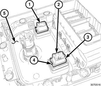 1. Align the tabs on each 2nd row heated seat switch (1 and 2) with the openings in the floor console rear trim panel (5) and install the switches, as necessary. Push the switches firmly into the trim panel until the two retaining tabs (3 and 4) are fully engaged.
