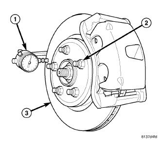 4. Mount Dial Indicator (1), Special Tool , with Wheel, Special Tool , or equivalent, to knuckle. Position Dial Indicator Wheel to contact rotor braking surface approximately ten millimeters from outer edge of rotor (3).