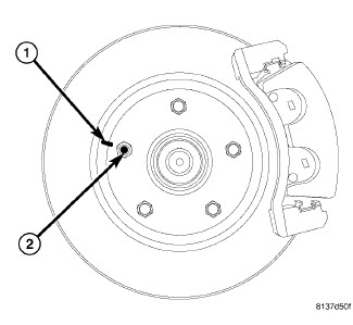 9. Mount Dial Indicator (2), Special Tool , to the knuckle. Position Dial Indicator stem so it contacts hub face (1) near outer diameter. Care must be taken to position stem outside of stud circle, but inside of chamfer on the hub rim.