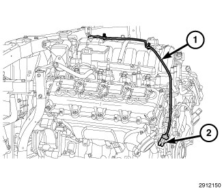 The 5.7L engine block heater (2) is mounted in the cylinder block, near the left rear corner. The engine block heater is a dry cylinder type design and is powered by 110 volt AC.