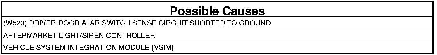 - Repair the (W523) Driver Door Ajar Switch Sense circuit for a short to ground.