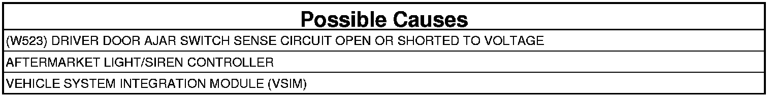 - Repair the (W523) Driver Door Ajar Switch Sense circuit for a short to voltage.