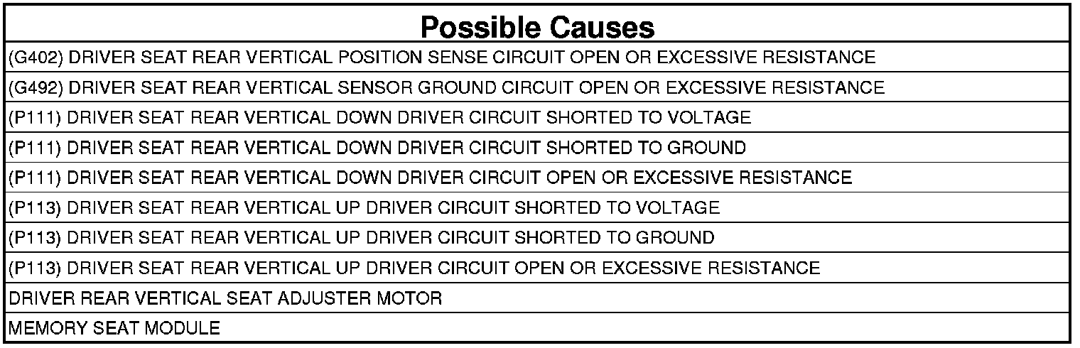 - Repair the short to ground in the (P113) Driver Seat Rear Vertical Up Driver circuit.