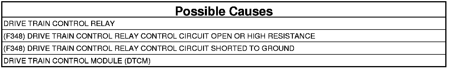 - Repair the (F348) Drive Train Control Relay Control circuit for an open or high resistance.