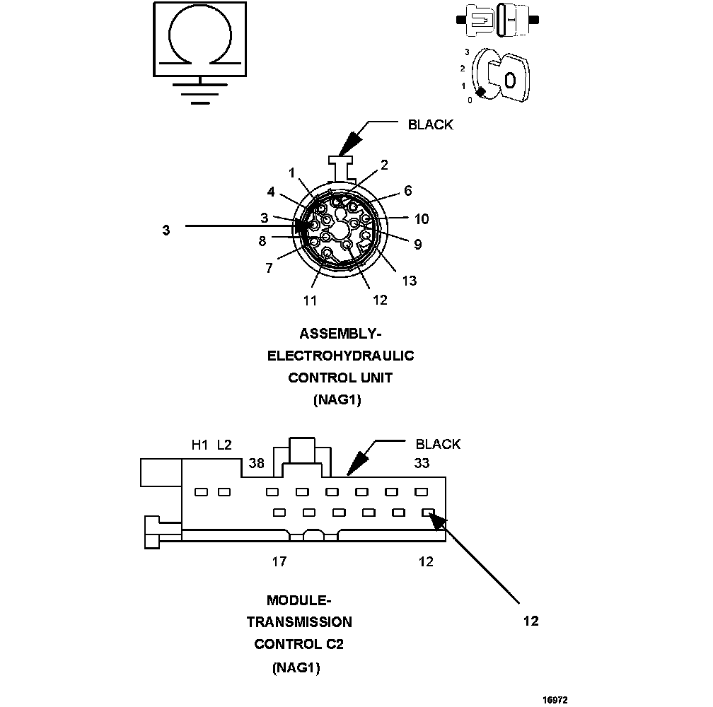 1. Measure the resistance between the (T13) Sensor Ground circuit to all the other circuits in the Electrohydraulic Control Unit Assembly harness connector.