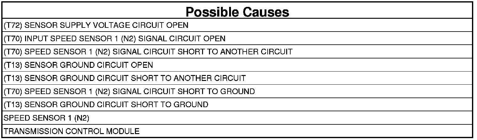 - Repair the (T70) Input Speed Sensor 1 (N2) Signal circuit for an open.