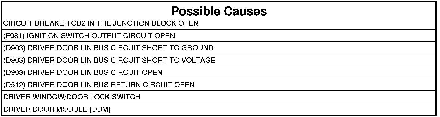 - Repair the (D903) Driver Door LIN Bus circuit for a short to voltage.