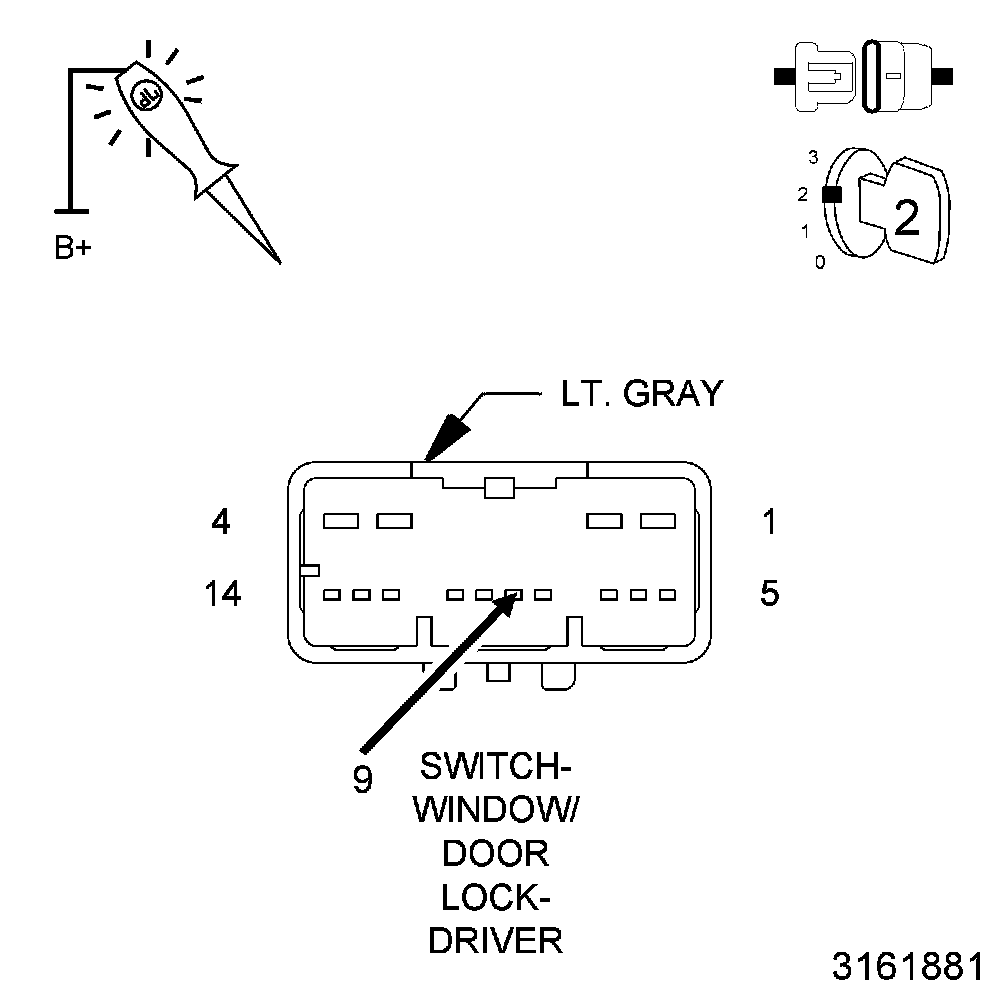 5. Using a 12-volt test light connected to Ground, check the (F981) Ignition Switch Output circuit in the Driver Window/Door Lock Switch harness connector.