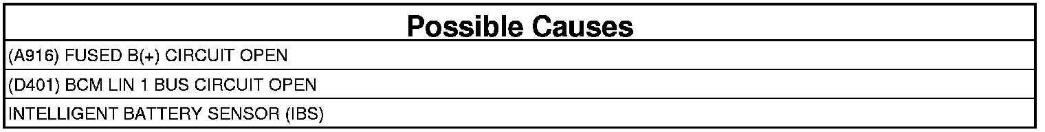 The Body Control Module (BCM) does not receive any information from the Intelligent Battery Sensor (IBS) for more than two seconds.