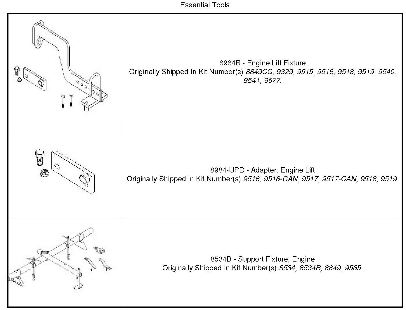 14. Install the Engine Lift Fixture (1), Engine Lift Adapter (2) and the Engine Support Fixture (3).