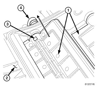 11. Remove the blend door cam (1) from blend door lever (2) and the pivot shaft located on the right side of the air distribution housing (3).